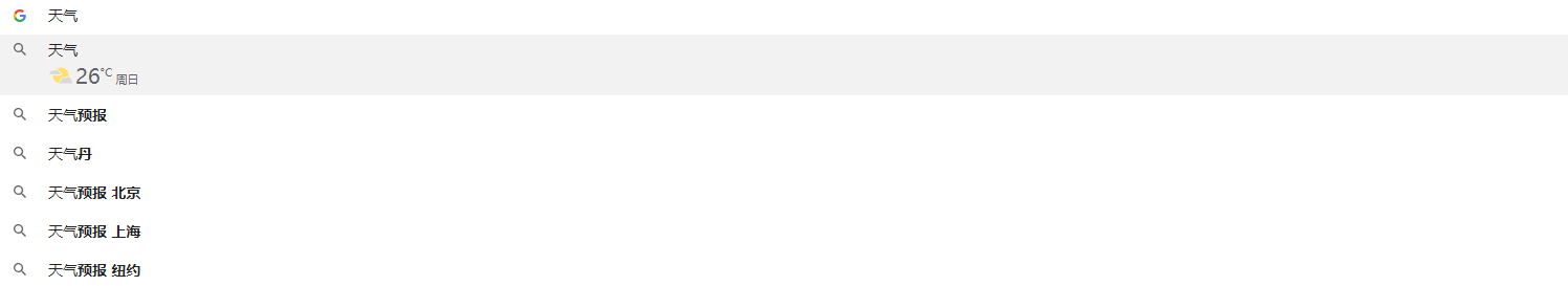 在 Omnibox 中输入「天气」,「tianqi」或是「weather」,在搜索建议中当即会显示出你所在位置的天气情况。