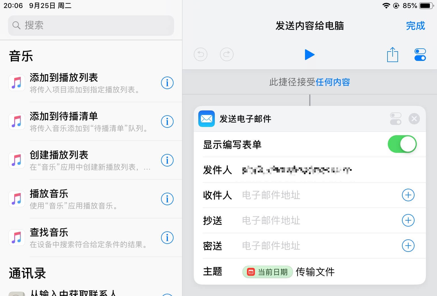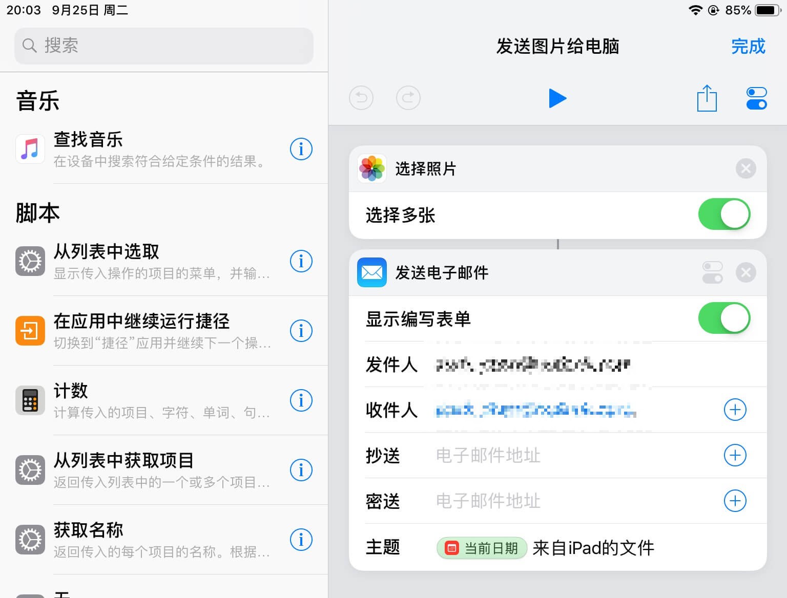 为了方便地从 iPad 向我的 Windows 笔记本传输图片,我制作了两个简单的「捷径」,一个在组件列表中显示,用于选择图片并发送到指定的邮箱,一个在「共享列表」中显示,用于发送特定的内容到邮箱。