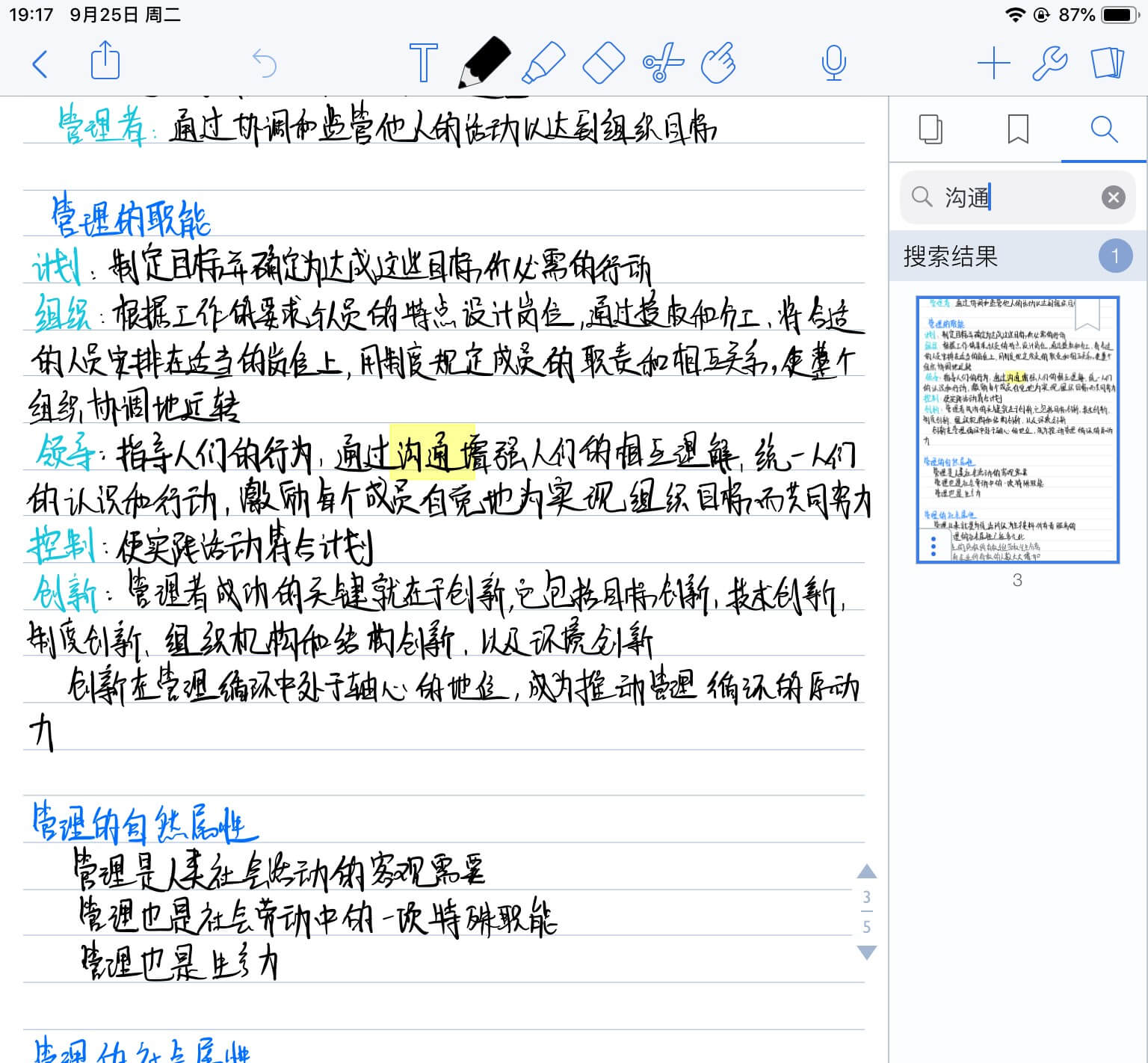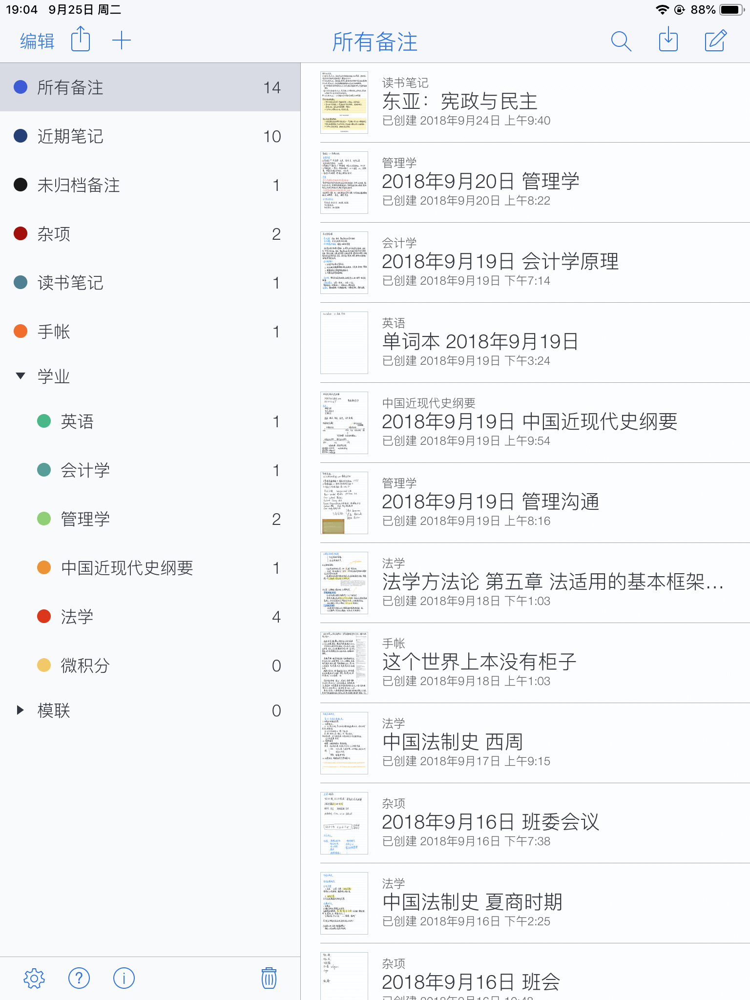 Notability 可以将笔记归类到不同的文件夹,而文件夹又可以归类到不同的项目之中。所有的笔记都可以按文件夹的形式进行索引。并且,在最近的更新中,notability 还增加了对手写内容搜索的支持。这样一来,查找笔记的内容变得更加方便了,「电子化笔记」更能凸显出其独特而不可替代的优势。
